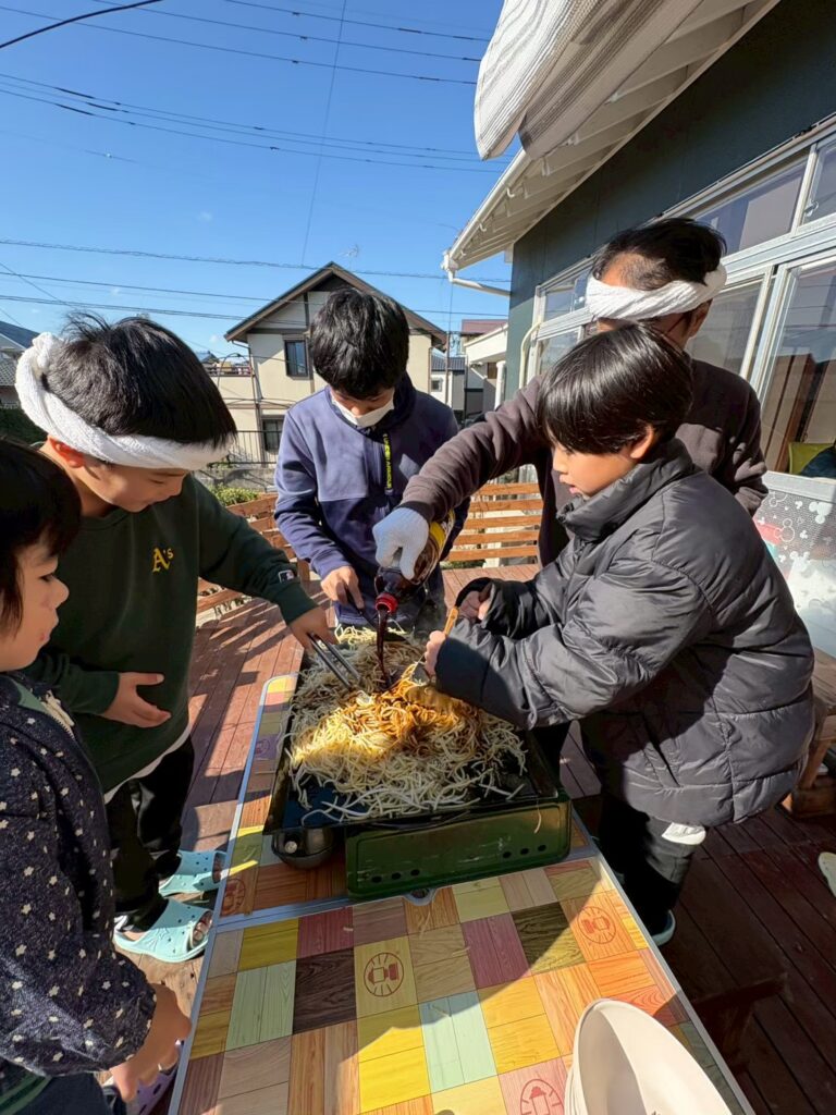 お天気がいい日はウッドデッキで焼きそば作りや飯ごう炊飯等アウトドア活動を
