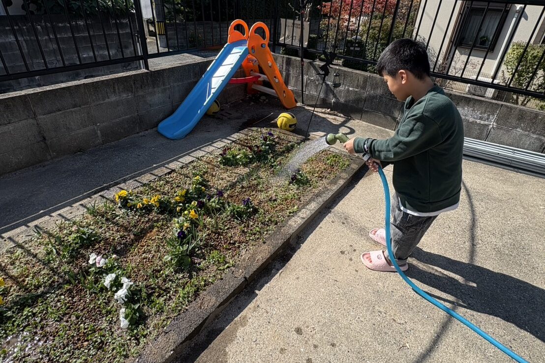 敷地内の広いお庭でお砂遊びをします。また、季節の野菜・お花を植え自分たちで水やりをします。
